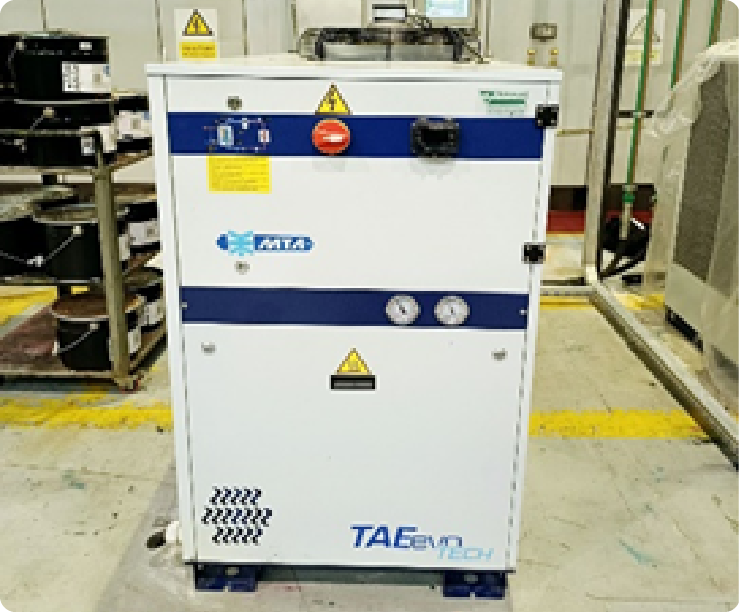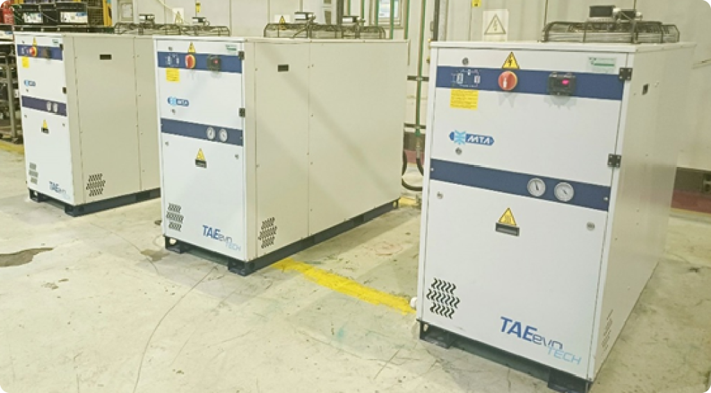 • Seamless Integration: MTA’s TAE chillers were installed and connected to each printing machine, with full support from our service department during startup, ensuring flawless operation.